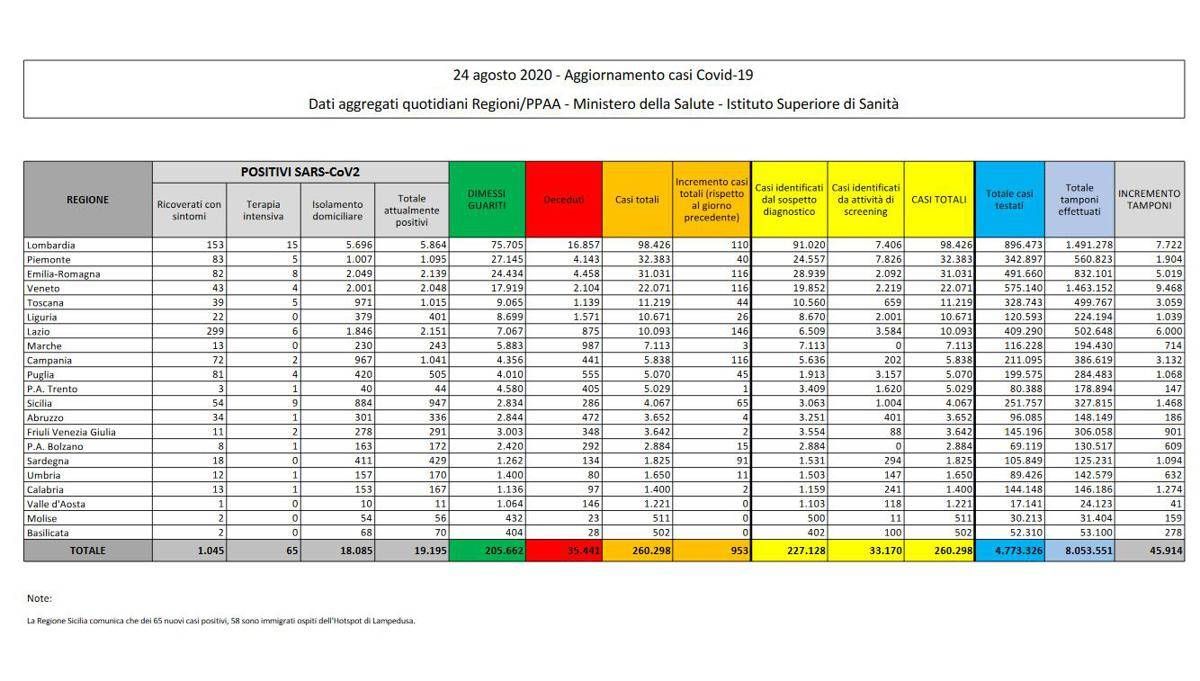 Il Covid-19 continua la sua corsa inarrestabile. Sono stati 953 nelle ultime 24 ore, 260.298 da inizio emergenza. Solo 1210 domenica.